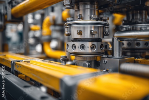 Fototapeta premium Close Up Of Industrial Machinery With Yellow And Gray Metal Pipes