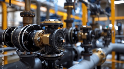 Fototapeta premium Close-up of industrial pipelines and valves in a factory setting,...