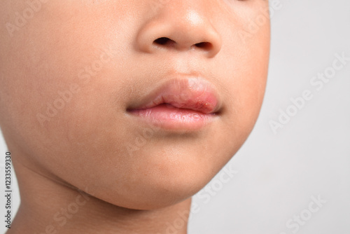 © Mulad Images, Obraz premium Close up of Injured Asian boy with swollen and bleeding mouth due to fall