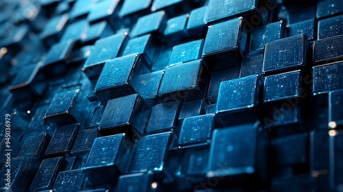 © ikkilostd, Obraz premium Close-up of interlocking blue translucent cubes creating a 3D abstract pattern.