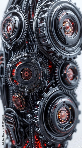 Fototapeta premium Close-up of intricate futuristic mechanical gears with glowing red elements....