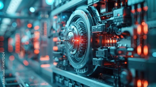 Fototapeta premium Close-up of intricate mechanical components with glowing lights, showcasing...