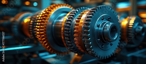 © GoDress, Fototapeta premium Close-up of intricate metal gears in industrial setting.
