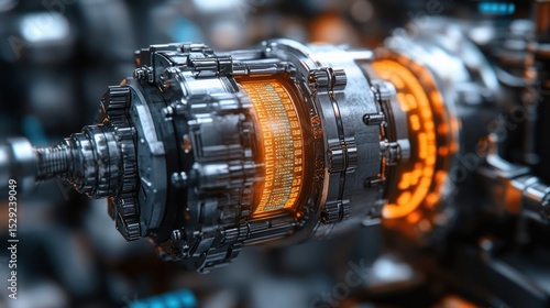 © Endang, Fototapeta premium Close-up of intricate, metallic engine part with glowing orange display