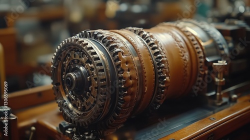 © nurman, Obraz premium Close-up of intricate vintage machinery; leather and metal components; detailed gears and mechanisms; industrial heritage; steampunk aesthetic.