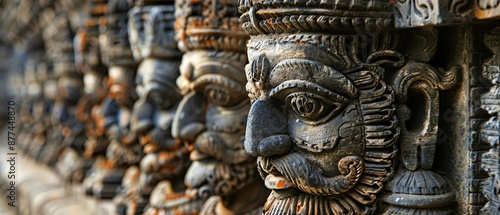 Fototapeta premium Close-up of intricately carved stone faces, showcasing traditional Indian...