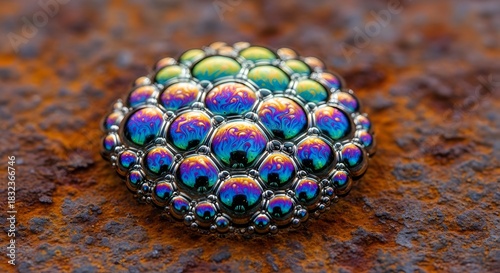 © Hafizpka, Fototapeta premium Close-up of Iridescent Soap Bubbles Cluster on Rusty Surface, Macro Photography, Outdoor Environment, Top View, Surface Tension Concept