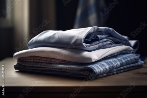 © Roman, Fototapeta premium Close up of ironed and folded shirts on table