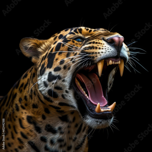 © tiero, Obraz premium close up of jaguar roaring on black background.