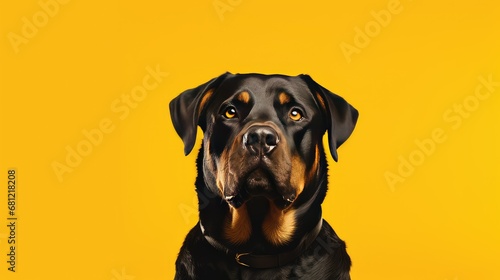 © jackson, Obraz premium Close-up of joyful Rottweiler on clean yellow backdrop.