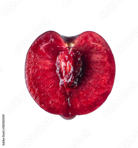 © Krafla, Obraz premium Close-up of juicy red cherry half isolated on transparent background
