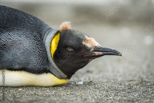 © Nick Dale, Naklejka premium Close-up of king penguin prone on beach
