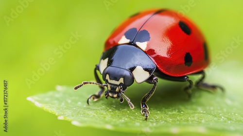 © THUA, Fototapeta premium Close up of ladybug on leaf in grassy field, showcasing its vibrant colors