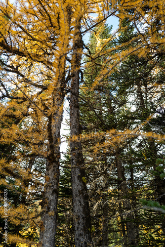 © Alex McDermid, Fototapeta premium Close up of Larches near Banff, Alberta, Canada on a fall day.