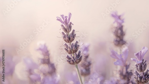 © Lasvu, Fototapeta premium Close-up of lavender blossoms with a blurred background and soft lighting