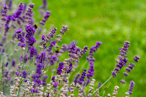 Fototapeta premium Close-up of lavender flowers with bumblebees pollinating fragrant purple...