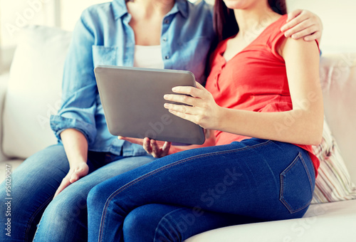 Naklejka premium close up of lesbian couple with tablet pc at home