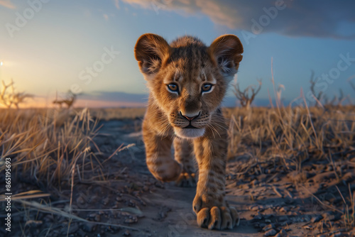 Obraz premium Close-up of Lion Cub in African Savannah Sunset