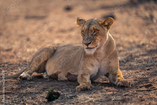 Naklejka premium Close-up of lioness lying covered with flies