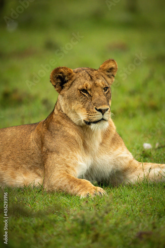 © Nick Dale, Obraz premium Close-up of lioness lying in wet grass