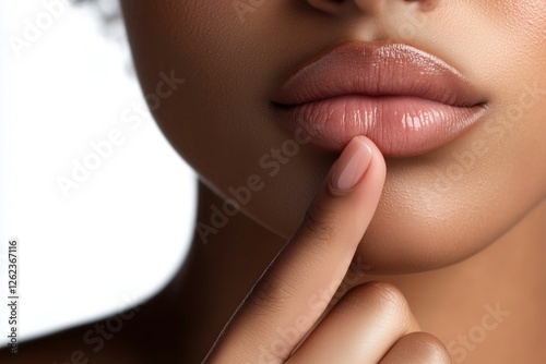 © SabsePahale, Obraz premium Close-Up of Lips: A close-up shot focusing on the luscious, full lips of a woman of color. Her finger gently touches her lower lip, adding a touch of intimacy and intrigue.