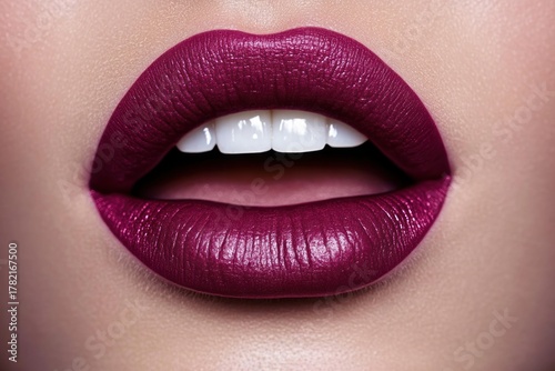 © Olya, Obraz premium Close-up of lips with smooth purple lipstick and slightly parted white teeth showing a sensual and polished look