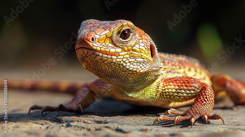 Fototapeta premium Close up of lizard basking in sunlight, showcasing vibrant colors and details