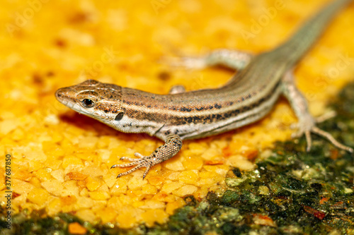 © Csar, Fototapeta premium Close-up of lizard (Podarcis hispanicus) with unfocused background on table of yellow tones
