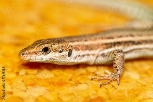 © Csar, Naklejka premium Close-up of lizard (Podarcis hispanicus) with unfocused background on table of yellow tones