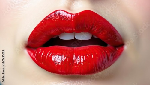 © Sunisa, Obraz premium Close-up of luscious red lips, pristine white backdrop, cosmetics, lipstick