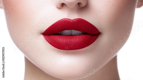 © Luna Scarlet, Obraz premium Close-up of luscious red lips with matte lipstick finish, showcasing bold beauty and elegance, perfect for use in makeup ads, cosmetic branding, or fashion-focused visuals.