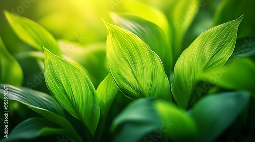 © idealxone, Obraz premium Close-up of Lush Green Leaves with Sunlight