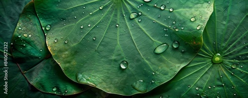 © Naphatson, Fototapeta premium Close-up of lush green leaves with water droplets.