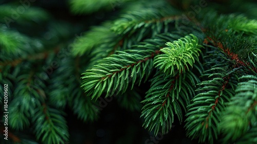 Fototapeta premium Close-up of lush green pine tree branches, showcasing vibrant needles and a rich texture, evoking a serene and natural atmosphere.