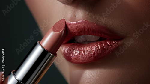 Obraz premium Close-Up of Lush Lips Applying Rose-Tinted Lipstick