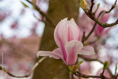 Obraz premium Close up of magnolia flowers with white and pink petals. Photographed with a macro lens. Magnolia trees flower for about three days a year in springtime.