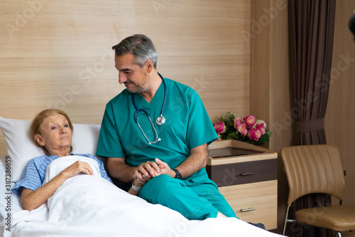 Fototapeta premium Close up of male doctor hands holding senior woman patient hand in hospital bed. comforting and support patient.