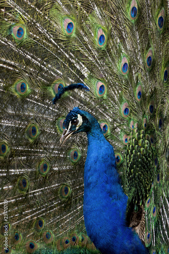 © Eric Isselée, Fototapeta premium Close-up of Male Indian Peafowl displaying tail feathers