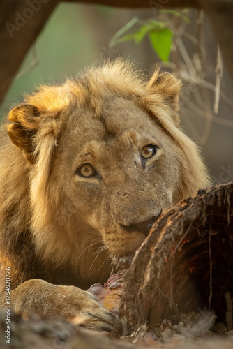 © Nick Dale, Naklejka premium Close-up of male lion lying gnawing zebra