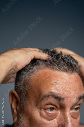 © Cultura Creative, Fototapeta premium Close-up of man styling hair against gray background