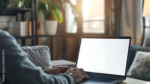 © Tanakrit, Fototapeta premium Close up of man typing on laptop with blank white screen in modern living room for Marketing and Advertising