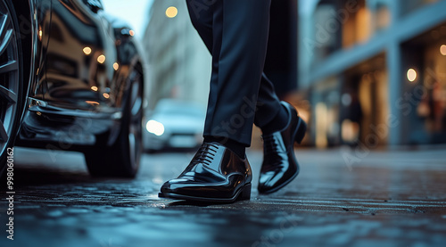 © Anastasiia Havelia, Fototapeta premium close up of man wearing black shoes stepping out from luxury car, business suit, blurry background, car on the left side of frame,