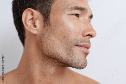 © Marut, Fototapeta premium Close up of man with enlarged pores and uneven skin texture showing natural facial hair and smooth skin tone, expressing calm and confidence in neutral background