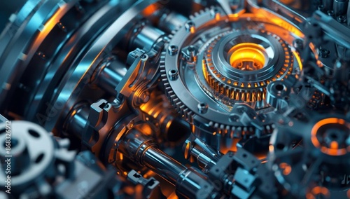 © VGX Ultra, Fototapeta premium Close-up of Mechanic Pistons with Industrial Blue and Orange
