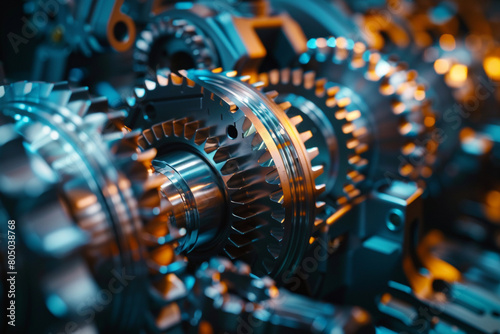 Fototapeta premium Close-up of mechanical gears and components, intricate engineering design,...