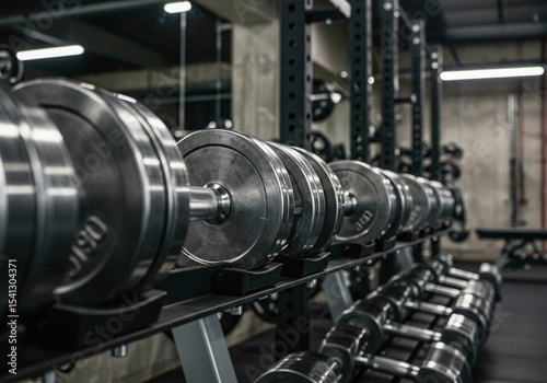 Fototapeta premium Close-up of metal dumbbells neatly arranged on a gym rack