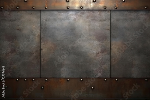 Fototapeta premium Close up of metal plate with rivets, suitable for industrial or construction concepts in design, manufacturing, or engineering visuals.. old rusty metal background