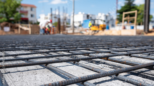 © Maksym, Fototapeta premium Close-up of metal rebar grid integrated with conduit paths around a house construction base