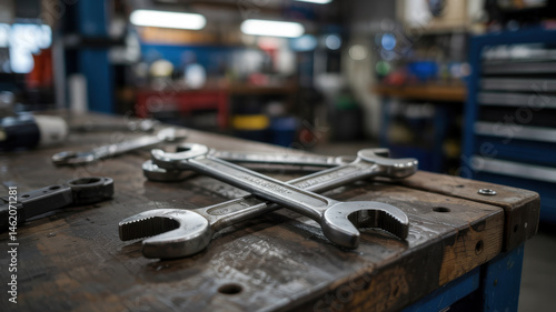 Fototapeta premium close-up of metal wrenches arranged on a worn wooden workbench in an industrial garage or mechanical repair shop, symbolizing manual labor and craftsmanship