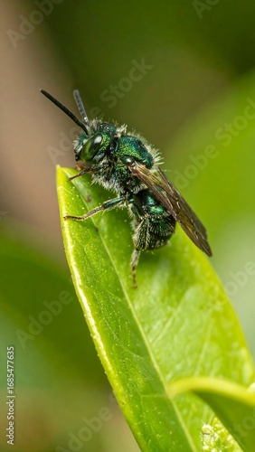 Naklejka premium Close-up of metallic green bee on leaf